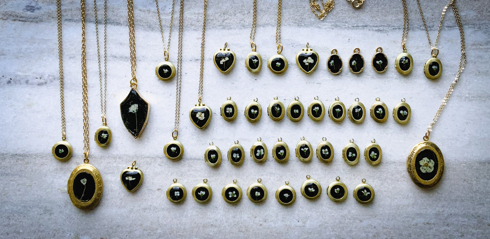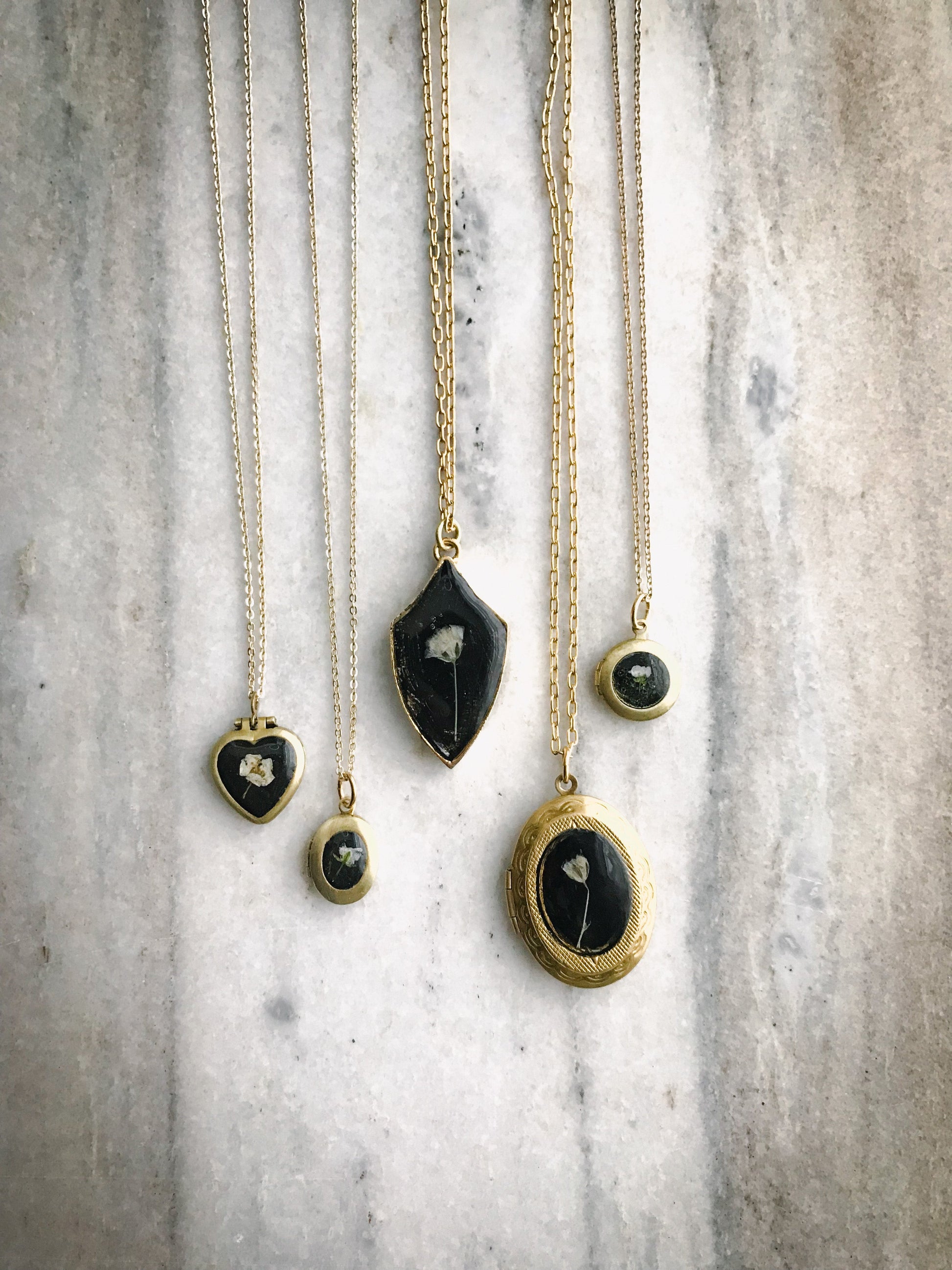 Tiny REAL flowers set into nickel-free brass lockets. Limited edition on 18” nickel free hypoallergenic 14k gold plated brass chain.